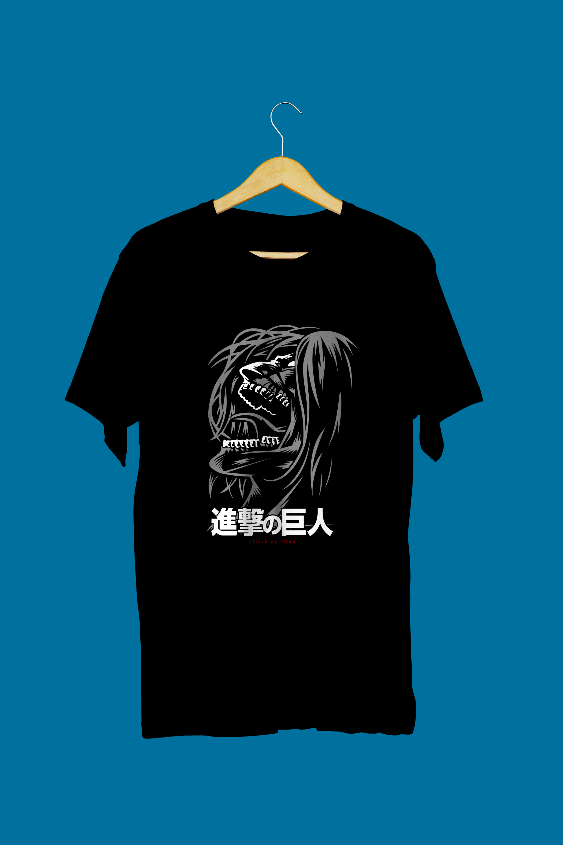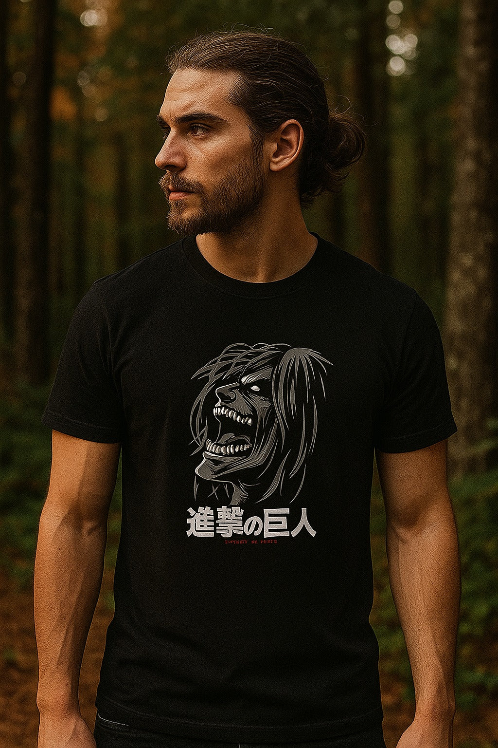 Unleash the power of the Titans with this bold and fierce Attack on Titan t-shirt. Featuring a striking monochrome design of Eren Yeager’s Titan form, this tee captures the raw intensity of the series with intricate linework and a menacing expression. The iconic Japanese title 進撃の巨人 sits below the graphic, paired with the English translation Attack on Titan, making it perfect for anime fans who appreciate both style and authenticity.