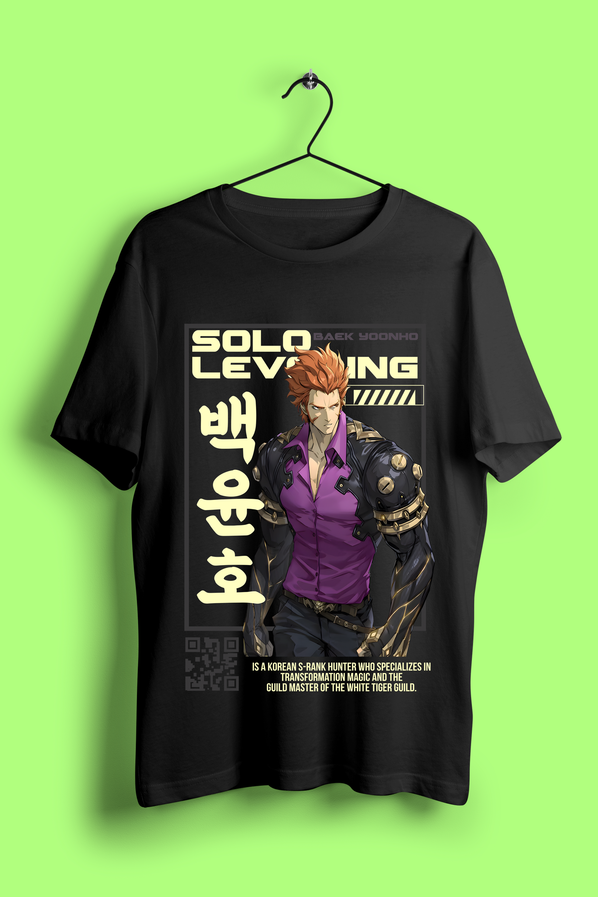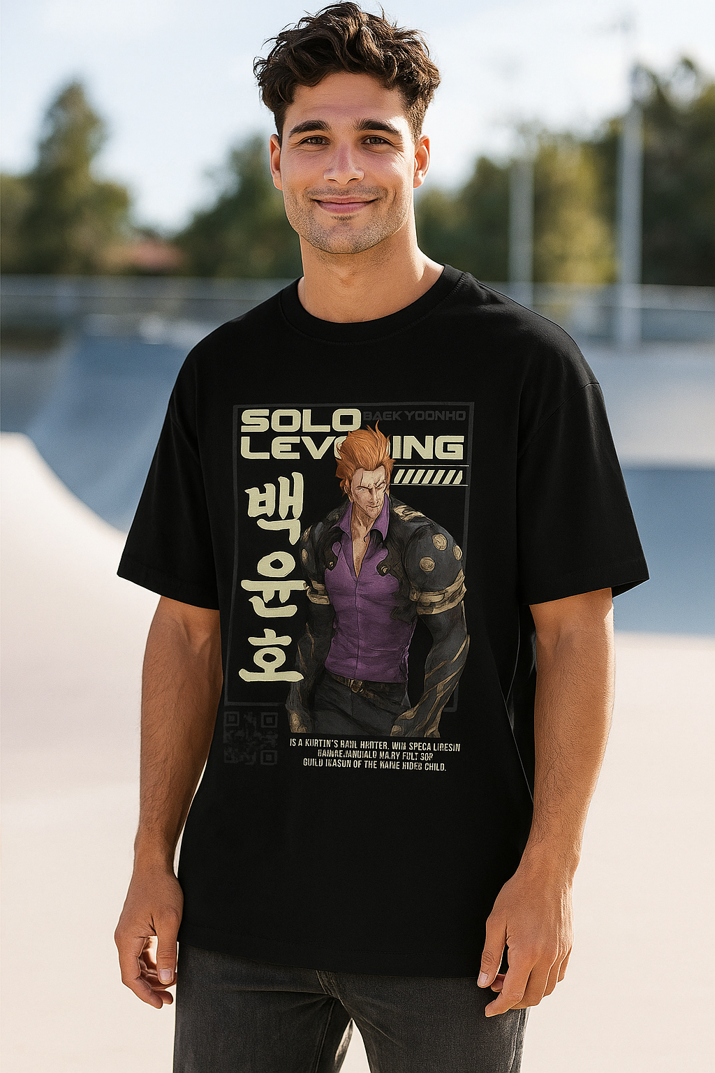 Step into the world of shadows with this powerful oversized tee featuring Baek Yoonho, the S-Rank hunter and White Tiger Guild Master from Solo Leveling. Designed for fans who live and breathe manhwa, this t-shirt delivers intense detail, vibrant colors, and standout streetwear style.