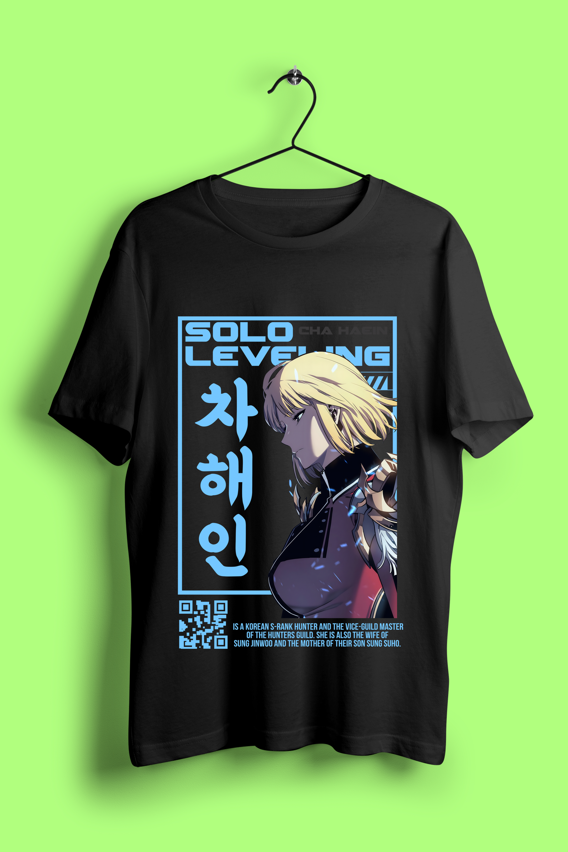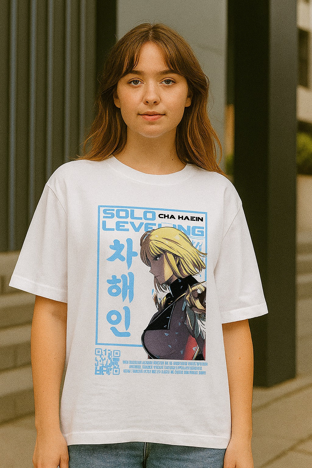 Channel elegance and strength with this stunning oversized tee featuring Cha Hae-In, the graceful S-Rank hunter and vice-guild master from Solo Leveling. Designed for fans who admire both beauty and power, this shirt blends soft streetwear with anime edge.