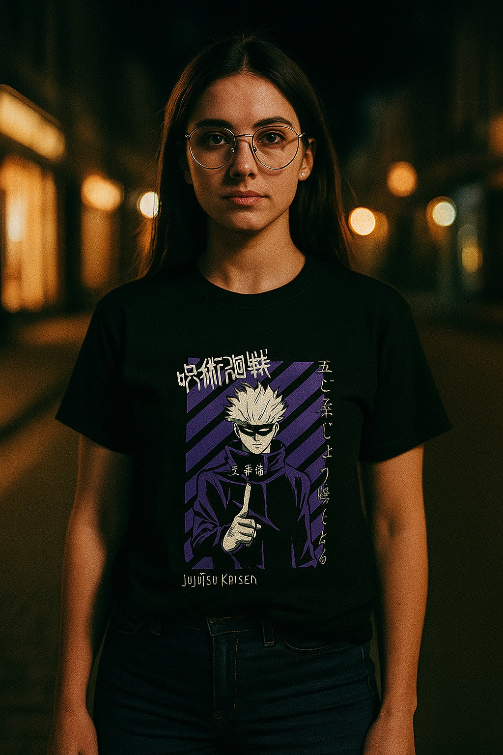 Whether you rep it in classic white or stealth black, this Gojo Satoru T-shirt is a must-have for every Jujutsu Kaisen fan. Featuring the iconic blindfolded sorcerer in a bold purple graphic with Japanese text accents, this tee delivers anime attitude with a streetwear twist.