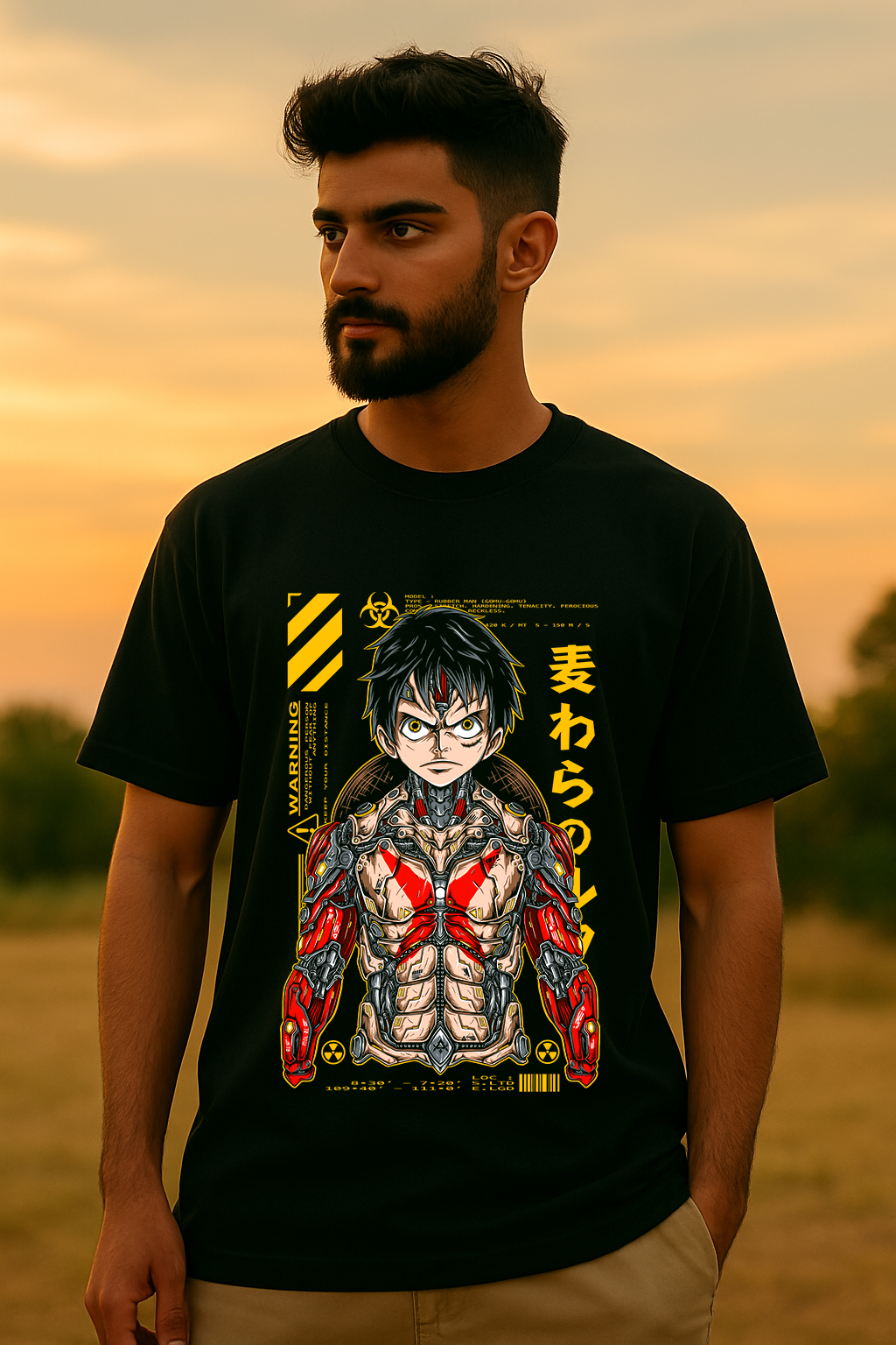 Unleash your inner fighter with our Bio-Enhanced Anime Warrior Tee – where cyberpunk intensity meets Japanese streetwear. This black oversized T-shirt features a bold, high-detail anime design of a cyber-armored character with glowing red elements and Japanese typography that radiates raw energy.