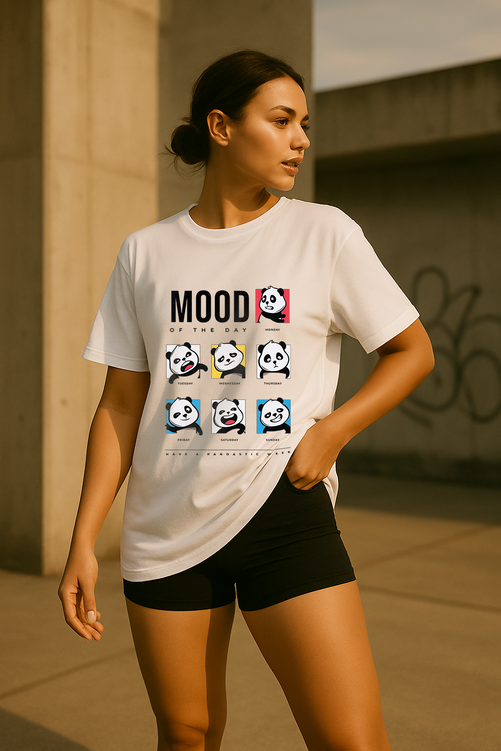 Start every day with a smile (or a side-eye ) in our super cute and comfy “Mood of the Day” oversized T-shirt. Featuring a different panda mood for each day of the week, this tee is perfect for showing off your vibe—whether it’s sleepy Monday or party-mode Saturday