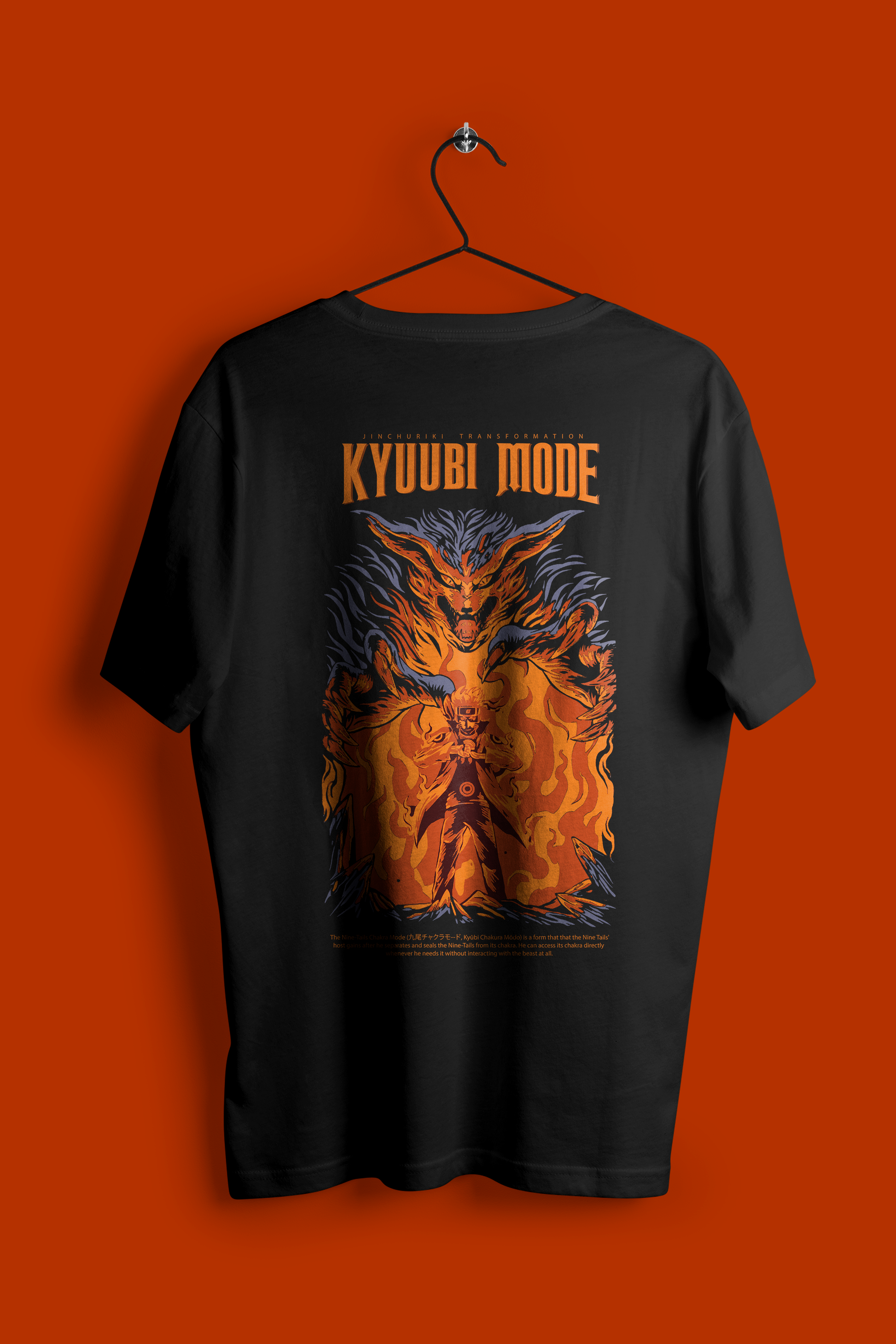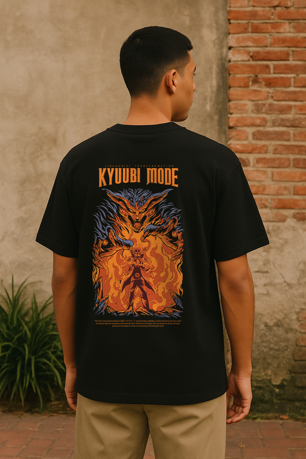 Printed on premium black cotton, the artwork highlights the raw, fiery chakra of Kurama as he surrounds Naruto in beast mode—symbolizing strength, resilience, and pure determination.